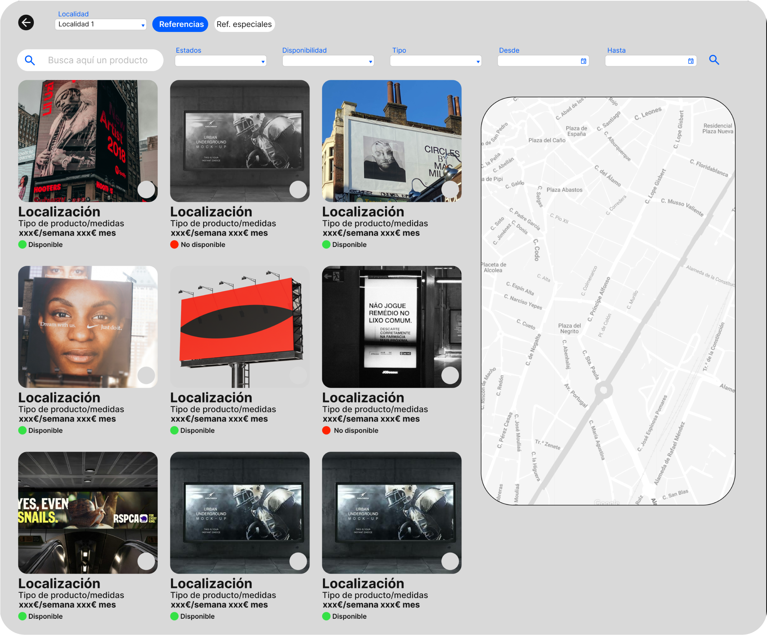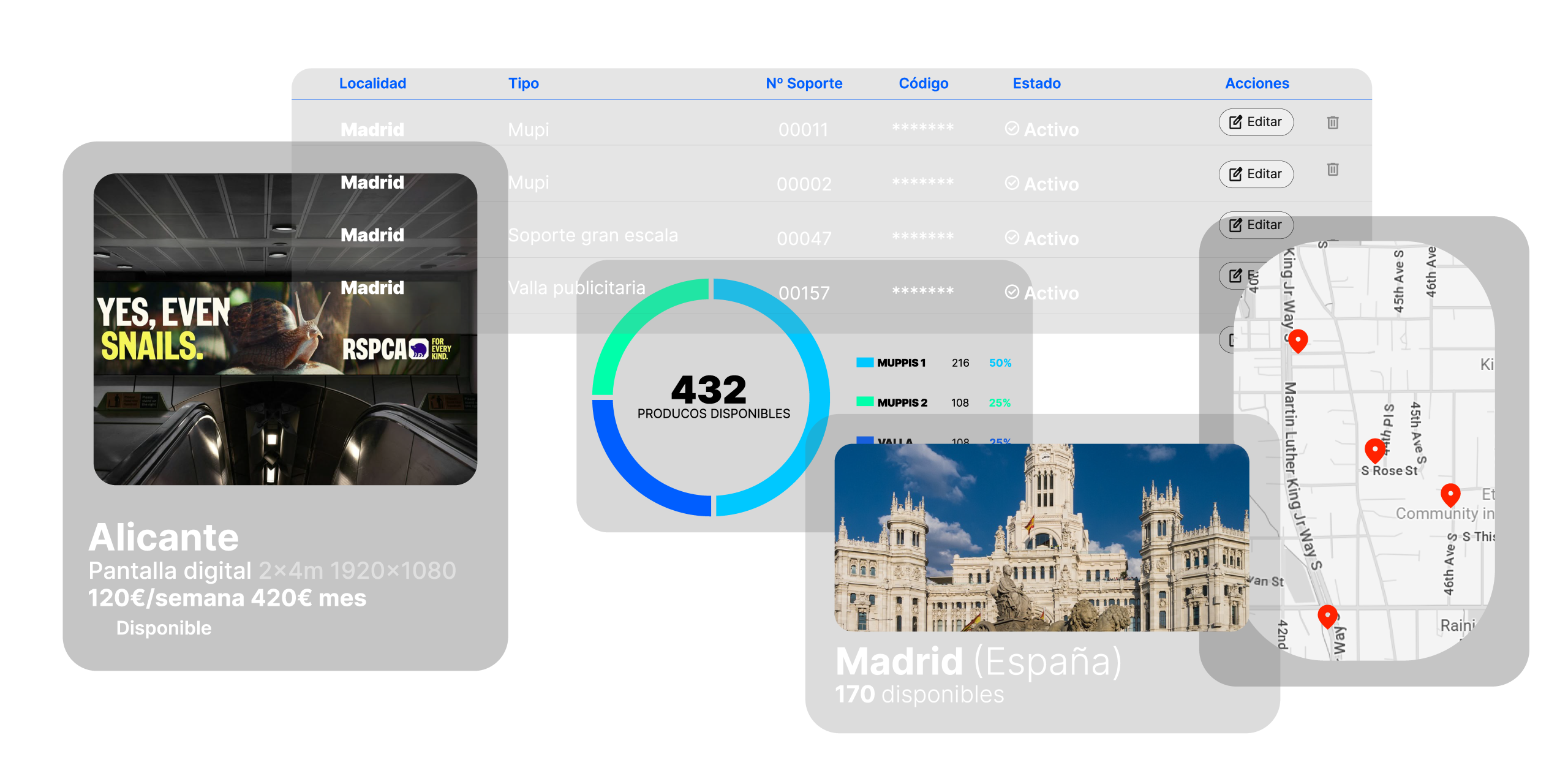 Inventario completo de soportes (OOH/DOOH) con fotos y geolocalización